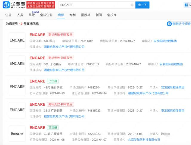 此外,中国城市报查询企查查信息发现,安发国际控股集团曾申请“ENCARE”商标,其中多数被判无效初审被驳回。
