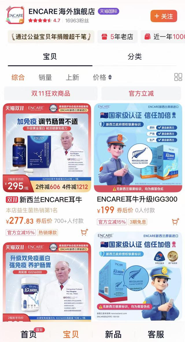 据悉,@劉嘉玲晒出的图片显示为一家名为“ENCARE海外旗舰店”的店铺,该店铺标识中含“天猫国际”字样,其售卖的产品中,有一款名为“新西兰ENCARE耳牛免疫球蛋白”的商品,商品首页图放置了梁朝伟半身照片。